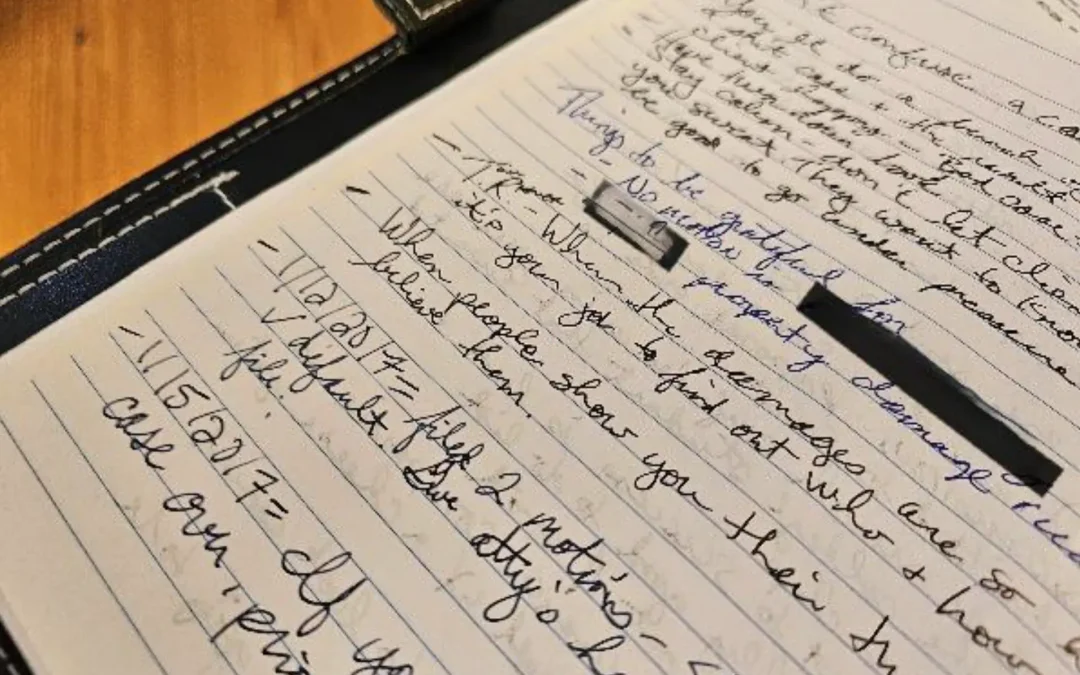In my early career, on Mondays I worked till 12 a.m., Tuesdays till 11 p.m., Wednesdays till 10 p.m., and Thursdays till 9 p.m. I soaked up everything I could. I literally have a book of quotes and lessons learned over that year (picture above) filled with overheard quotes from Jay to his staff (Melissa and Lisa), lessons learned, and experiences documented. Lunch was every day at noon and the topics were cases, opposing counsel, and experiences. Meals came out dry or salty, but I was learning.